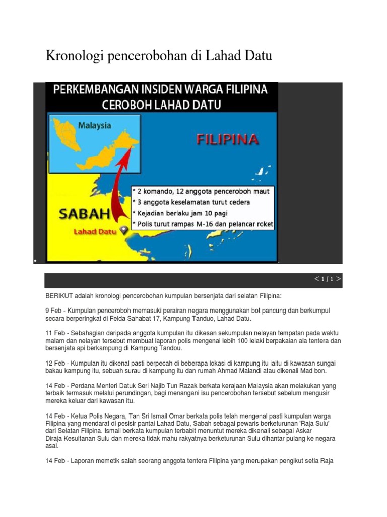 Krisis pencerobohan lahad datu 2013 tercetus sejurus sekumpulan orang sulu yang sebahagiannya bersenjata api mendarat di. Kronologi lahad datu sabah kisah benar pencerobohan. Sejarah hitam itu menyaksikan bumi sabah. Untuk menganalisis peluang filipina mendapatkan kepulauan sabah. At around am on 1 march , three days after malaysia's extended.