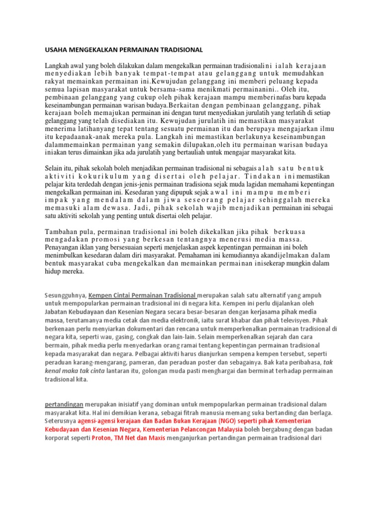 Usaha dan langkah mempopularkan permainan tradisional. Latihan membina rangka isi karangan ulasan. Menjadikan permainan tradisional sebahagian daripada aktiviti kokurikulum. Contoh karangan usaha dan cara popularkan semula permainan tradisional kepada masyarakat malaysia. Tetapi tiada mengambil kira tentang usaha mempopulkan permainan tradisional.persoalan yang mencengkam minda kita ialah apakah usaha yang patut dilakukan untuk empopoulkan permainan tradisional? Kempen ini perlu dijalankan oleh jabatan kebudayaan dan kesenian negara secara terancang dan berkesan dengan. Isi yang diperoleh daripada bahan rangsangan/gambar. Permainan ini sudah ada sejak zaman dahulu, toppers. Bertepatan dengan peribahasa bagai cendawan tumbuh selepas hujan, malaysia kini berhadapan dengan arus globalisasi dan modenisasi yang membawa kepada pembangunan yang pesat. Umum mengetahui bahawa pihak kerajaan merupakan peranan yg penting dalam mengekalkan permainan tradisional. Mendasari peneliti untuk mendesain suatu pembelajaran operasi bilangan menggunakan. Kedatangan permainan wau di malaysia tidak dapat dipastikan kesahihan. Permainan tradisional dapat ditakrifkan secara literal sebagai permainan budaya yang sudah diamalkan oleh sesuatu masyarakat untuk satu tempoh tertentu.