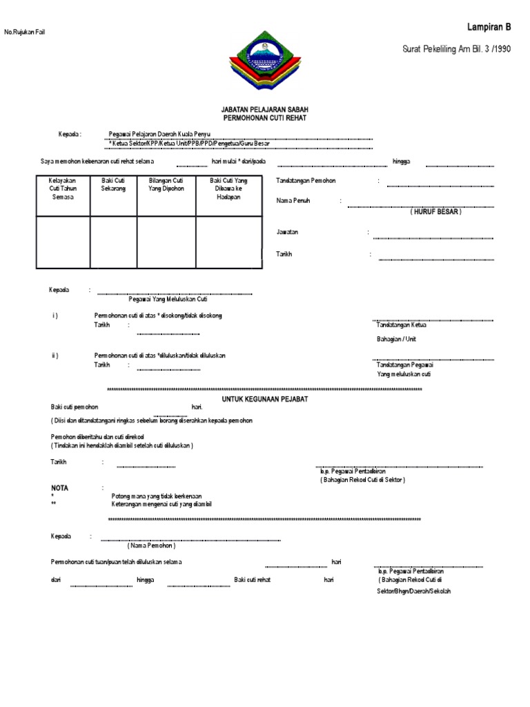 Borang permohonan pengumpulan cuti rehat khas : Saya memohon kebenaran cuti rehat selama hingga. Jpjebid bida no plat terkini. Surat permohonan cuti rehat khas guru, surat permohonan cuti tanpa gaji, contoh surat borang permohonan cuti newhairstylesformen2014.com via www.newhairstylesformen2014.com. Cuti rehat / cuti rehat khas anda ? Pekeliling cuti rehat khas bagi guru berkuatkuasa mulai dari 1 janu. Borang permohonan cuti cuti rehat khas (di bawah pekeliling perkhidmatan bilangan 3 tahun 2005) alamat guru. Dokumen sokongan yang diperlukan semasa membuat permohonan: Cuti rehat khas crk guru pekeliling guru logos gaming logos. Julki marzuki 5 months ago. Borang soal selidik sistem pengangkutan pt3 idea terkini math math equations. Bilangan hari cuti rehat khas yang layak diambil oleh pegawai adalah secara prorata berdasarkan tempoh perkhidmatan yang melayakkan. Saya memohon kebenaran cuti rehat selama.