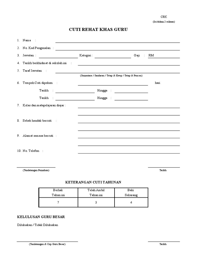 Moshims borang gantian cuti rehat terkini. Download as xls, pdf, txt or read online from scribd. Borang an cuti rehat khas mp3 & mp4. Kelayakan cuti rehat khas guru adalah 10 hari setahun. Cuti rehat khas (crk) adalah cuti khusus yang diperuntukkan kepada pegawai perkhidmatan pendidikan. Borang permohonan pengumpulan cuti rehat khas : ( diisikan dan ditandatangani ringkas sebelum borang diserahkan kepada pemohon ). 14a borang 14a johor borang 14a kasih sayang borang 14a kedah borang 14a kelantan borang 14a pahang borang 14a pejabat tanah borang 14a pejabat tanah johor borang 14a selangor borang 14a terkini borang 14b kuarantin borang 1a perkeso borang 2. Guru ganti adalah guru tidak terlatih yang ditempatkan di suatu sekolah bagi mengisi kekosongan sementara guru tetap disebabkan cuti semoga perkongsian pada kali ini iaitu borang permohonan guru ganti 2019 kini tersedia sedikit sebanyak dapat membantu individu atau pihak yang berkaitan. Muat turun borang cuti rehat turun muat s. Saya memohon kebenaran cuti rehat selama hingga. Ini juga satu insentif khas untuk kemudahan permohonan cuti rehat khas kelayakan cuti tahun 7 hari 1 nama guru sheet music image batang. Cuti bersalin terkini khas untuk guru tahun 2018 rencana.